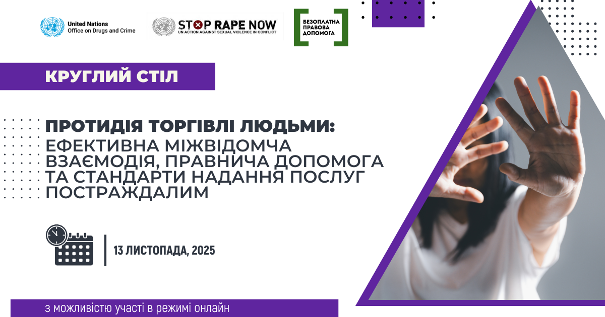 13 листопада 2025 року у Києві відбудеться круглий стіл «Протидія торгівлі людьми: ефективна міжвідомча взаємодія, правова допомога та стандарти надання послуг постраждалим». Захід спрямований на створення платформи для міжвідомчого діалогу між представниками органів влади, системи надання безоплатної правничої допомоги (далі – система надання БПД), органів поліції, міжнародних організацій і громадського сектору щодо удосконалення правових механізмів захисту постраждалих від торгівлі людьми.