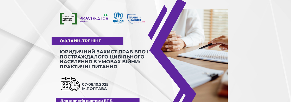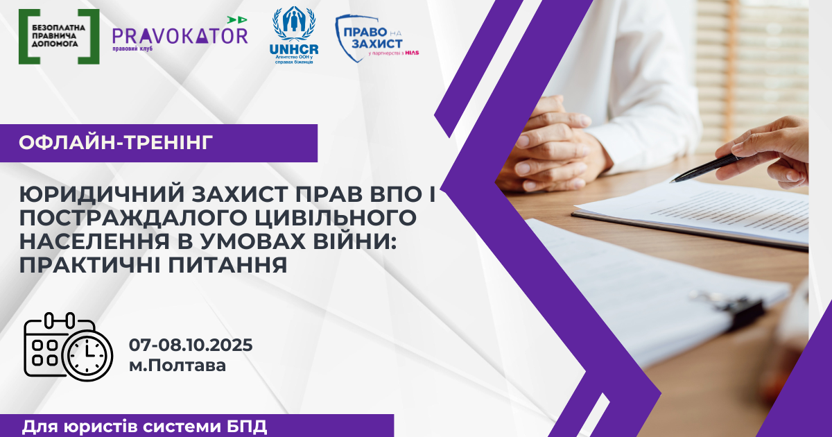 Координаційний центр з надання правничої допомоги спільно з Благодійним фондом «Право на захист» за підтримки УВКБ ООН організовує офлайн-тренінг «Юридичний захист прав ВПО і постраждалого цивільного населення в умовах війни: практичні питання» для юристів/ок системи надання безоплатної правничої допомоги з з Полтавської, Сумської та Харківської областей.