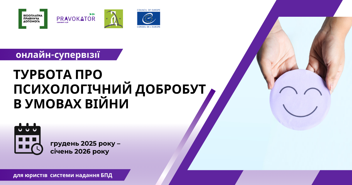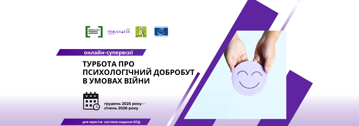 Координаційний центр з надання правничої допомоги у партнерстві з громадською організацією “Діалог у дії” за підтримки Офісу Ради Європи в Україні організовує проведення онлайн-супервізій після серії тренінгів “Турбота про психологічний добробут в умовах війни” для фахівців та фахівчинь управлінь надання безоплатної правничої допомоги міжрегіональних центрів з надання безоплатної правничої допомоги прифронтових регіонів.