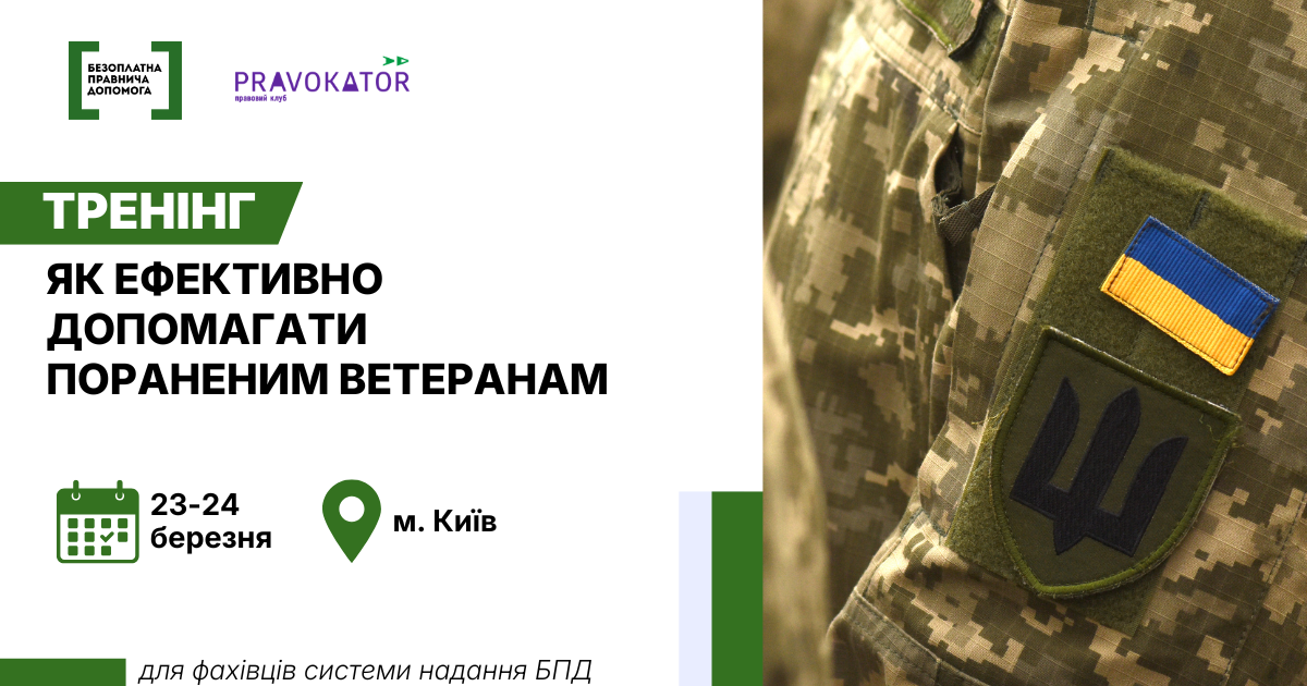 Координаційний центр з надання правничої допомоги у партнерстві з Правозахисним центром для військовослужбовців «Принцип» організовує проведення дводенного тренінгу «Як ефективно допомагати пораненим ветеранам» для юристів системи надання безоплатної правничої допомоги. Захід відбудеться 23-24 березня у місті Києві.