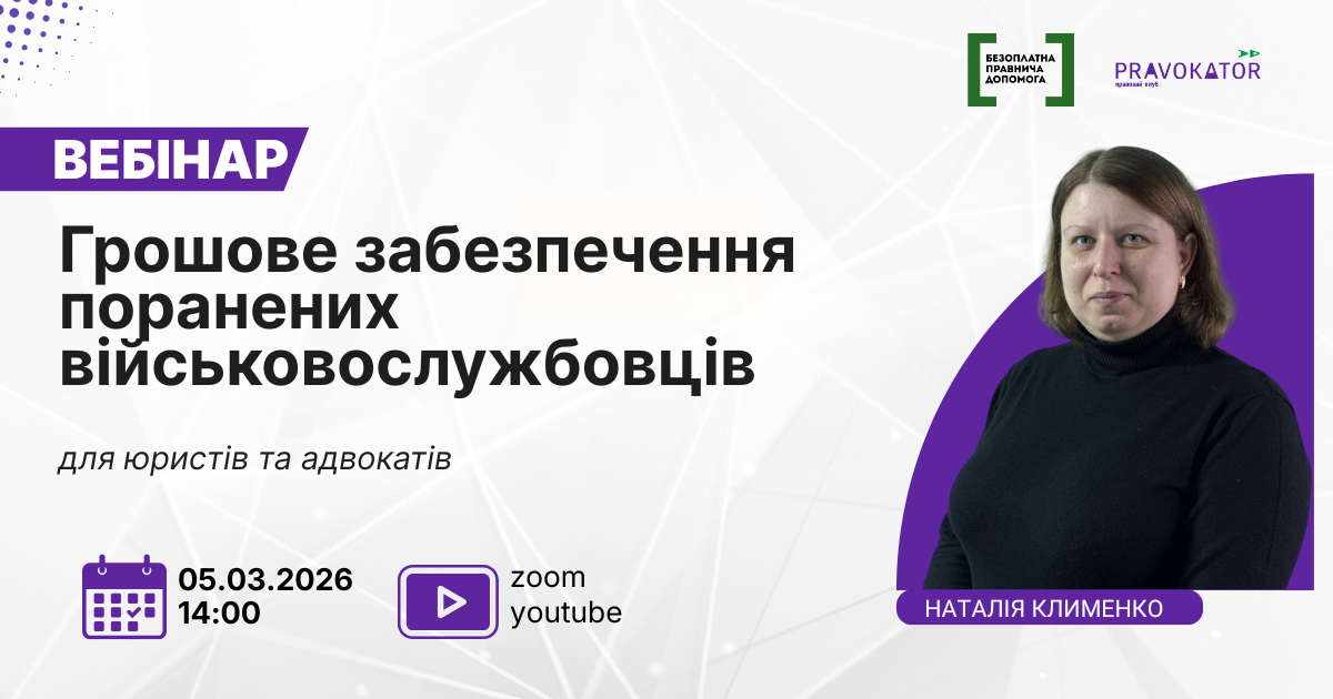 Запрошуємо юристів системи надання БПД та адвокатів на вебінар «Грошове забезпечення поранених військовослужбовців», де розберемося в ключових питаннях виплат, компенсацій і правових гарантій для захисників, які зазнали поранення. Поговоримо про порядок нарахування грошового забезпечення, додаткові виплати під час лікування, необхідні документи та типові помилки, які можуть призвести до затримок або відмов.