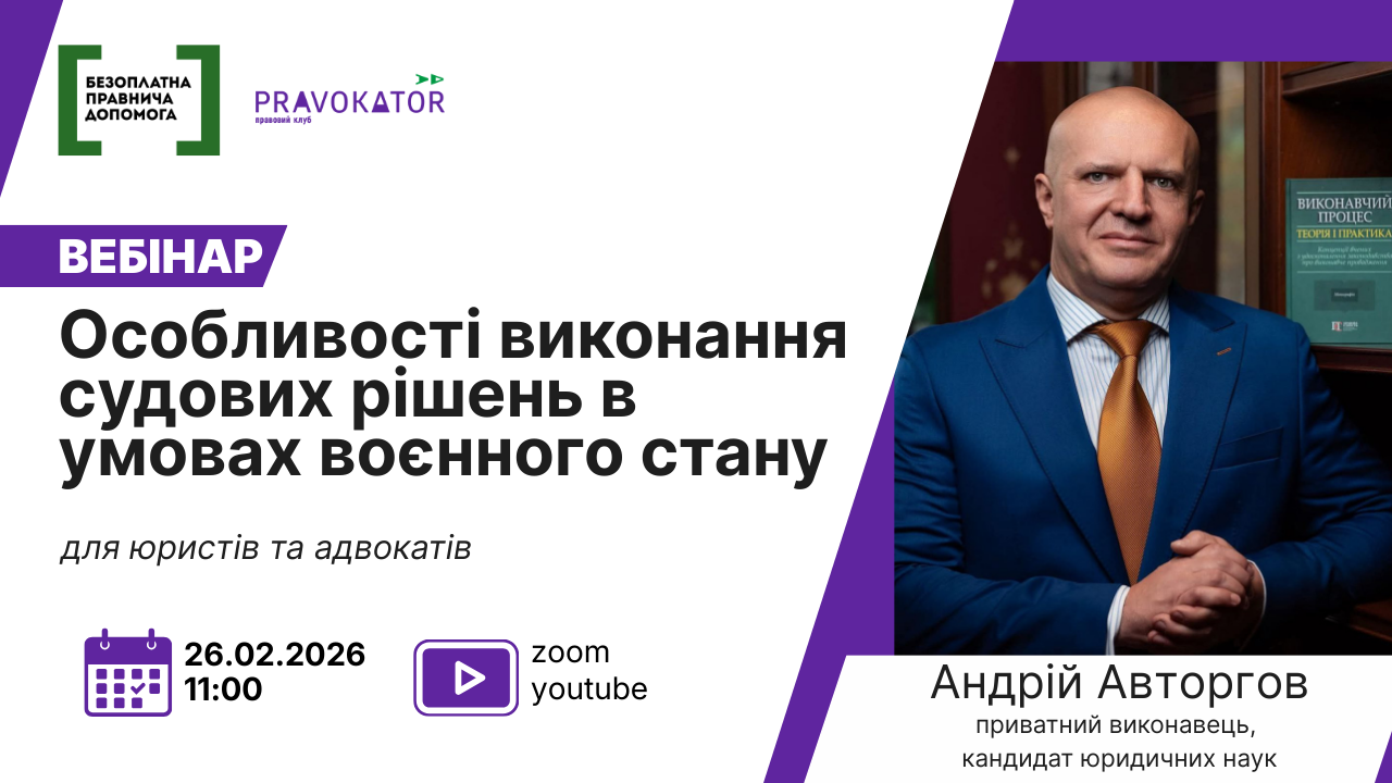 Запрошуємо адвокатів, юристів та всіх фахівців правничої сфери долучитися до професійного вебінару, присвяченого ключовим викликам виконавчого провадження в умовах війни.