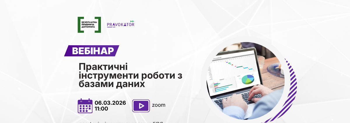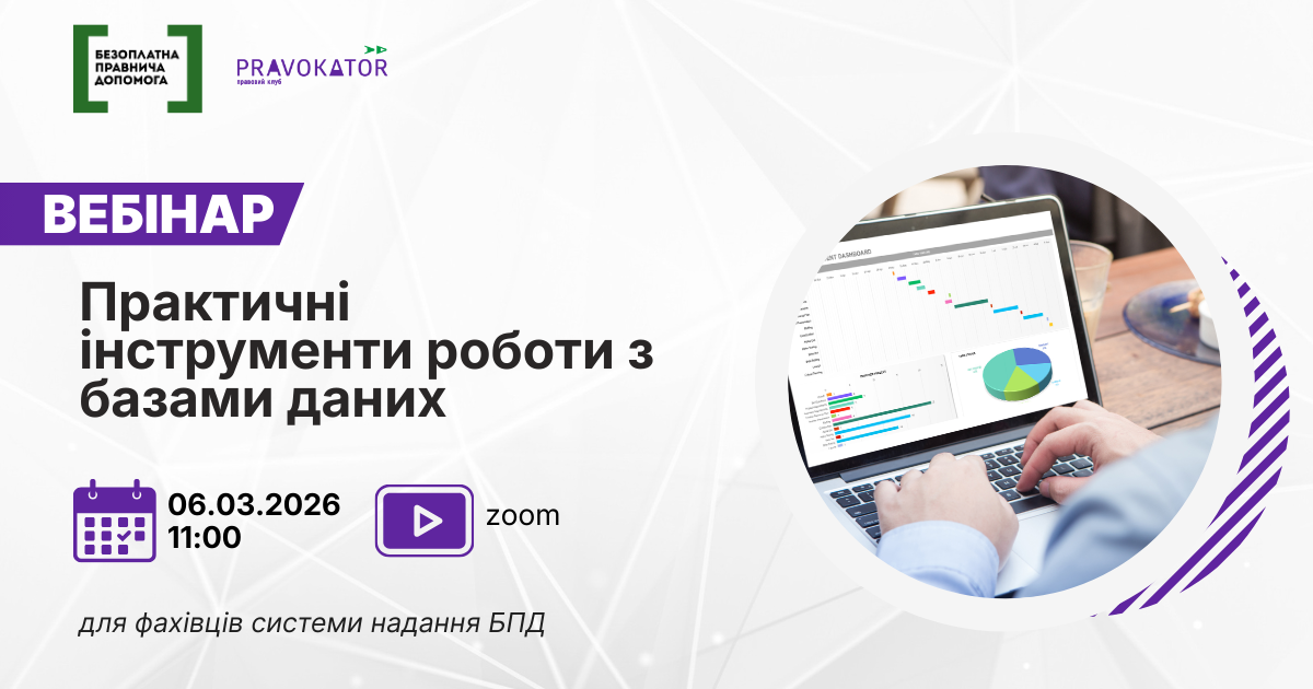 Координаційний центр з надання правничої допомоги організовує проведення вебінару “Практичні інструменти роботи з базами даних”. Під час вебінару будуть розглянуті практичні підходи до формування, перевірки та аналізу баз даних. Учасники дізнаються, як оптимізувати процеси обробки інформації, мінімізувати помилки та підвищити ефективність аналітичної роботи у щоденній діяльності.