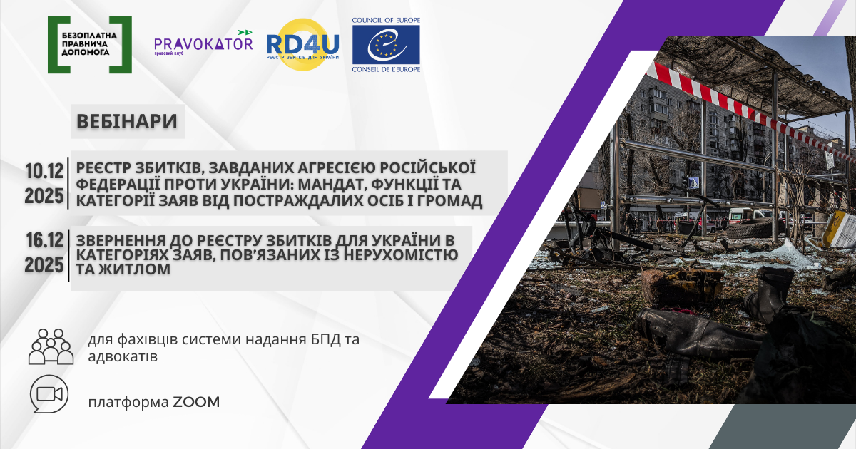 Координаційний центр з надання правничої допомоги спільно з Київським офісом Реєстру збитків, завданих агресією РФ проти України, планують продовження серії вебінарів з питань діяльності та порядку подачі заяв до Реєстру збитків для України.