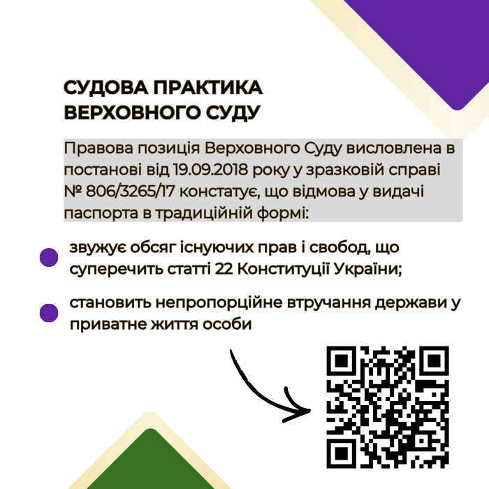 Правова позиція Верховного Суду висловлена в постанові від 19.09.2018 року у зразковій справі № 806/3265/17. констатує, що відмова у видачі паспорта в традиційній формі: